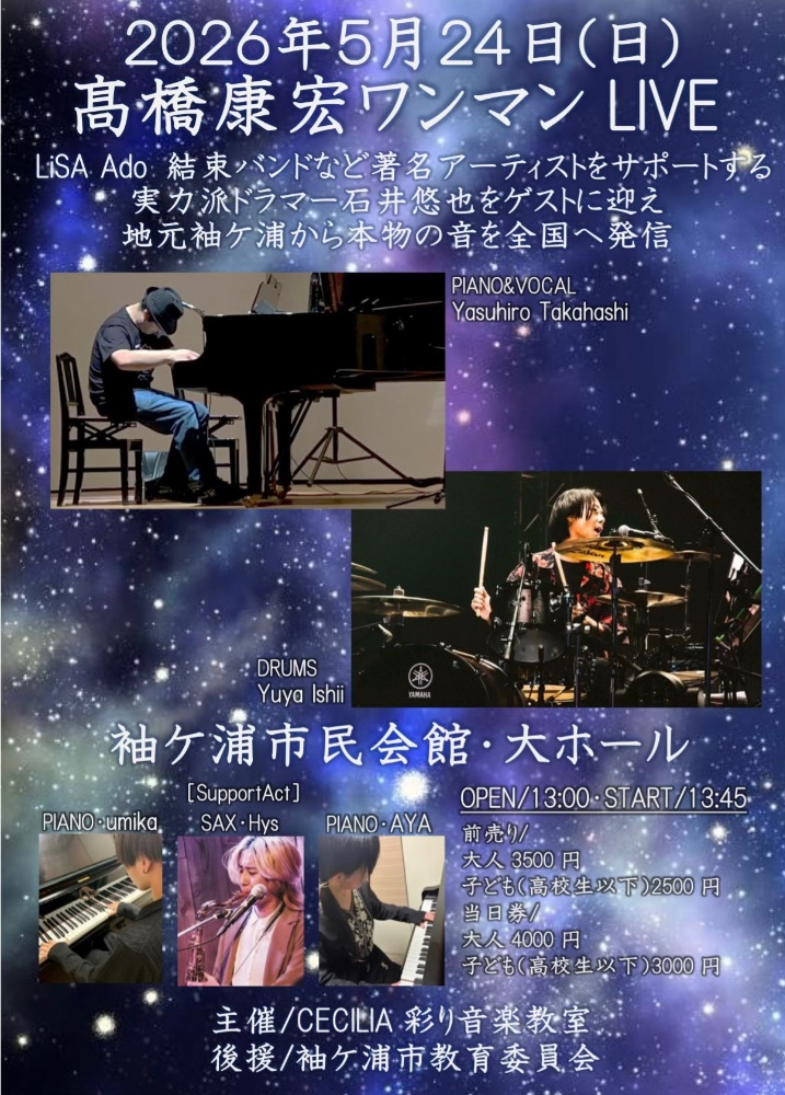 5月24日(日)袖ケ浦市民会館大ホールにて高橋康宏初ワンマンライブ開催決定‼️